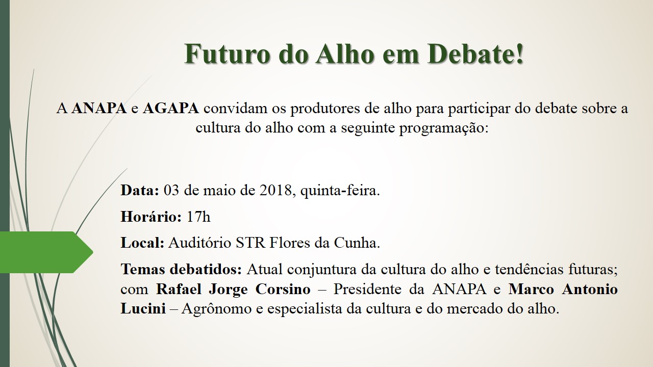 - Temas debatidos: Atual conjuntura da cultura do alho e tendências futuras; com Rafael Jorge Corsino – Presidente da ANAPA e Marco Antonio Lucini – Agrônomo e especialista da cultura e do mercado do alho.